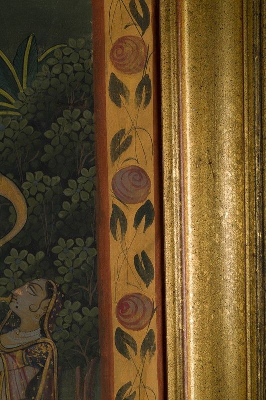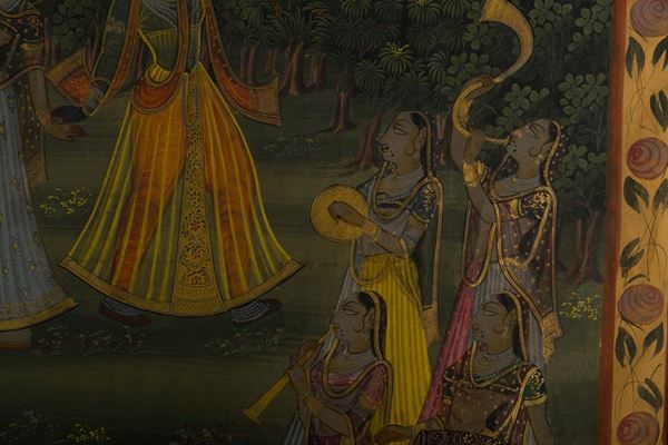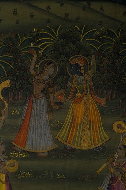 grande tela devozionale Hindu, destinata a decorare le pareti dei templi, raffigurante Gopi danzanti al tempio e Krsna. In cornice