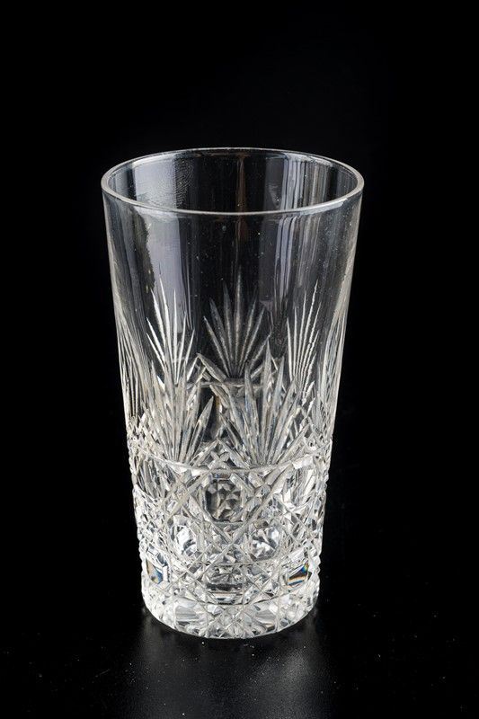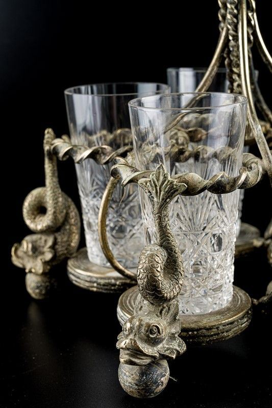 con decorazioni zoomorfe marine, completo di cinque bicchieri da liquore in cristallo