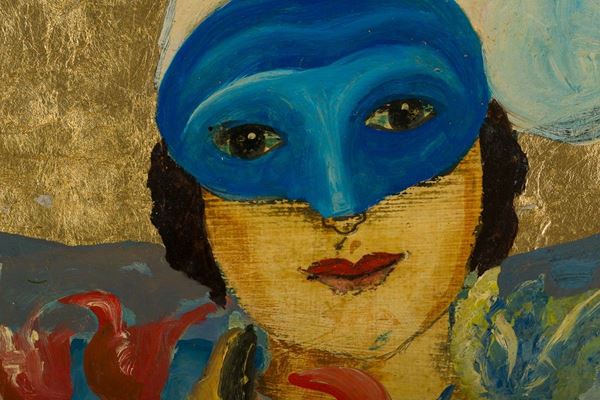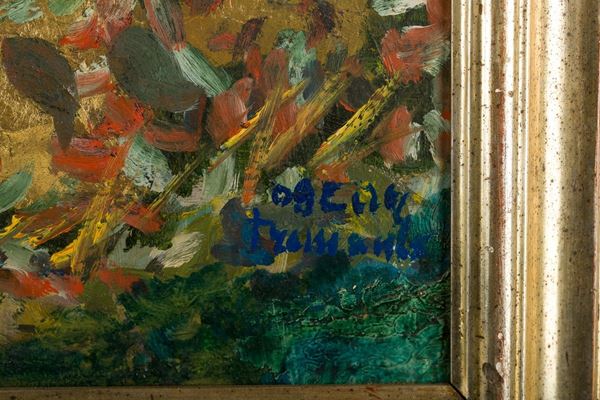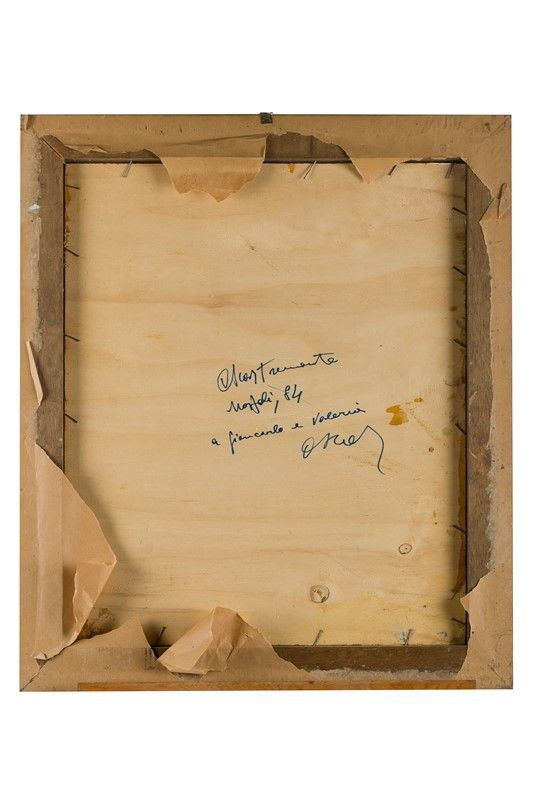firmato Oscar Tremante, con firma e dedica sul recto, Napoli '84, in cornice, cadute della foglio oro