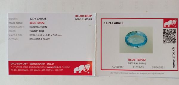 provenienza: Brasile - 12.74 carati - colore: Swiss Blue - forma: ovale - dimensioni: 16.62 x 12.49 x 7.63 mm - chiarezza: VS - trattato - taglio: brillante & fancy - con certificato GFCO (Laboratorio svizzero) AD13015P