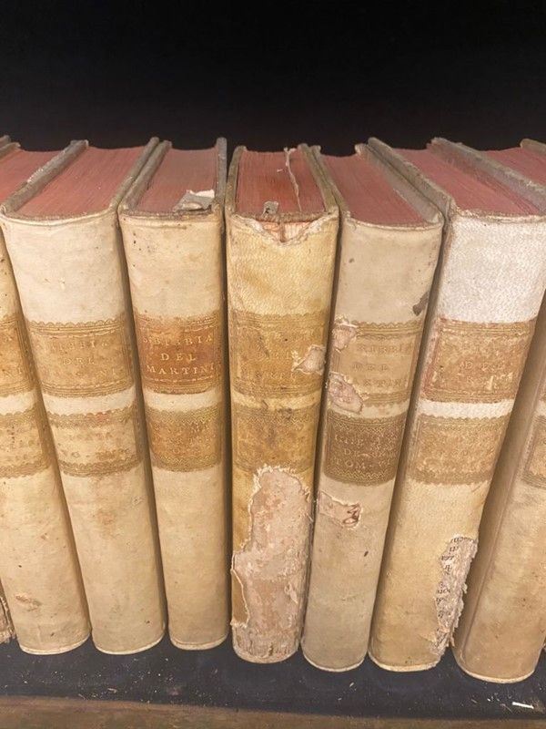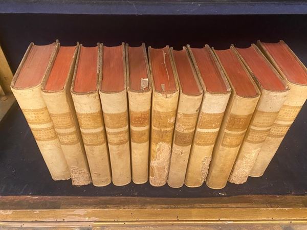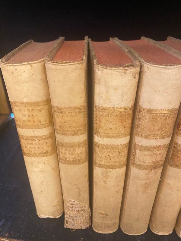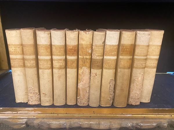 Volumi in 8°, legati in pergamena. Sguardie, occhiello, frontespizio. Macchie d'umidità, dorsi con mancanze.