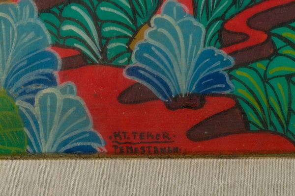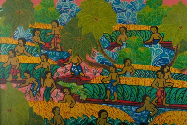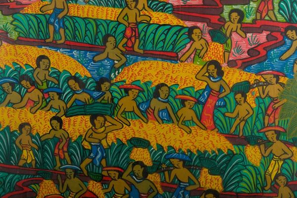 contadini a Bali, a firma di Kt. Teker, strappo della tela