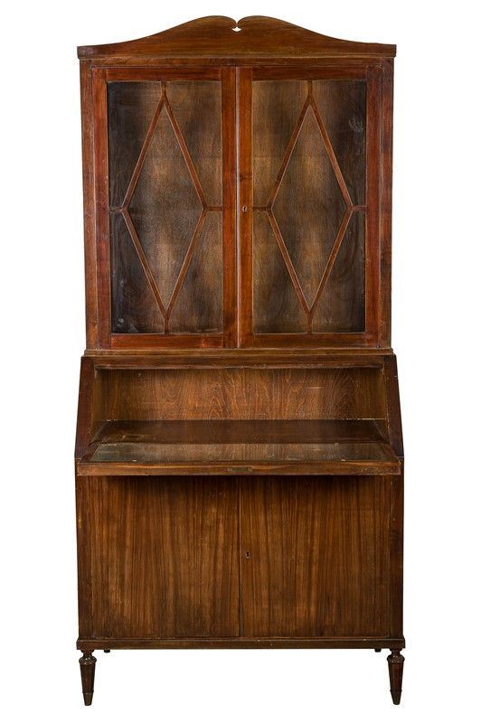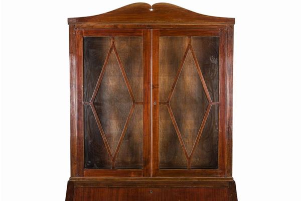 in mogano, composta da due pezzi separabili: una parte superiore con vetrina a due ripiani e la parte inferiore a due sportelli e piano calatoia. presenta dei piccoli difetti