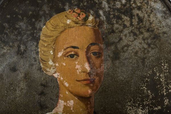Raffiguranti nobiluomo e nobildonna. In cornice. Ovale femminile con pesanti lacune e efflorescenze.