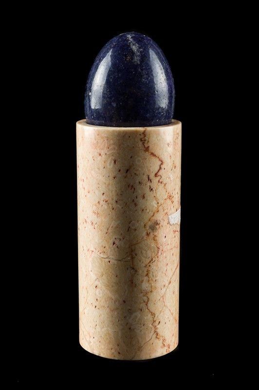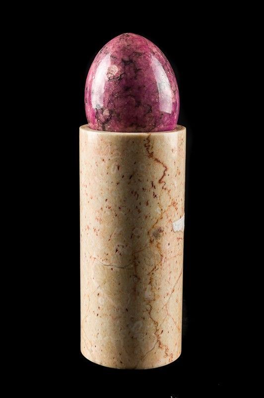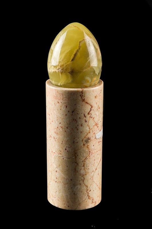 Lotto di nove uova da collezione in alabastro con base in marmo