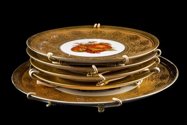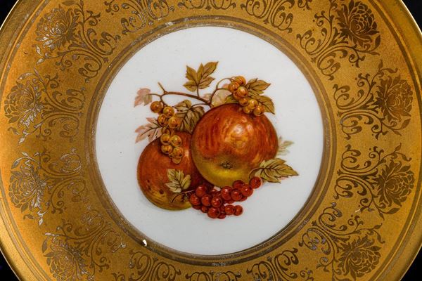 Set di 4 piattini da dolce e un piatto piano, decorati con frutti e incisi in oro.