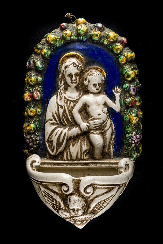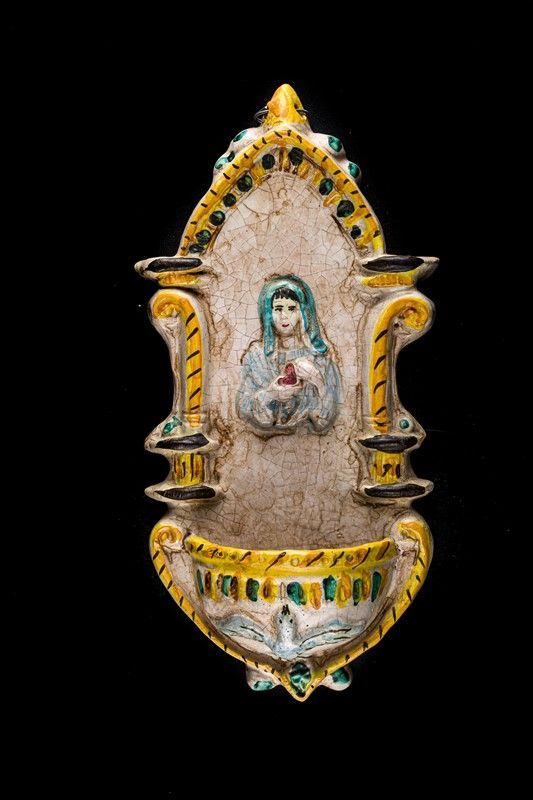 Di cui: acquasantiera raffigurante il Sacro Cuore di Maria, terracotta invetriata, decorata a mano in Amalfi (25 x 10 cm.); acquasantiera raffigurante Madonna con Bambino e festoni di frutta, ceramica policroma (26 x 13 cm).