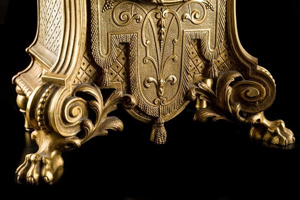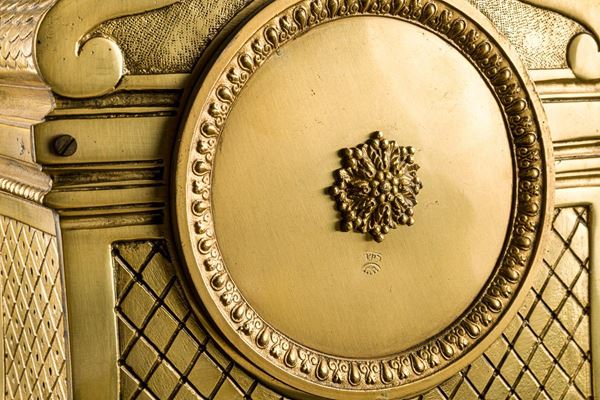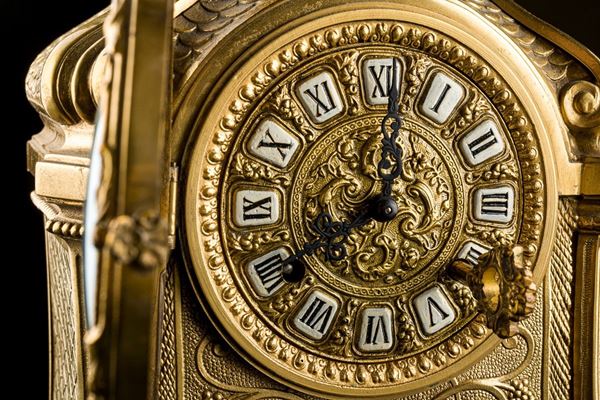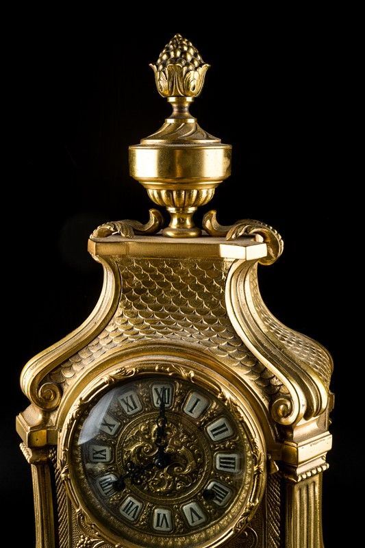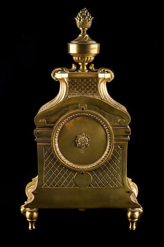 in metallo dorato, quadrante con numeri romani, parte superiore culminante a pigna