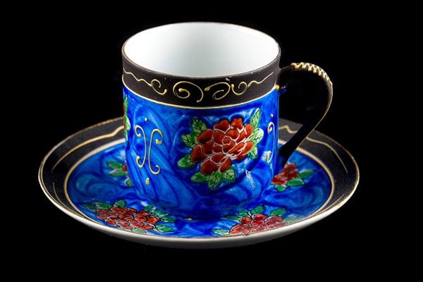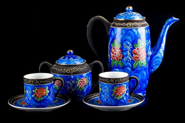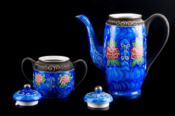 in ceramica policroma, fondo blu ceruleo con decoro floreale, marchio sul fondo. Il servizio è composto da: teiera, zuccheriera, 6 tazzine e 6 piattini