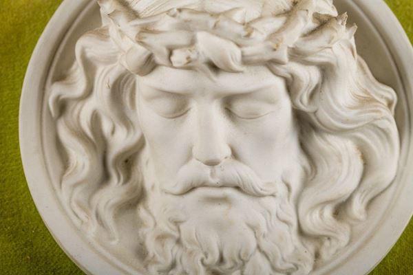 ovale in biscuit, entro cornice dorata foderata in velluto verde