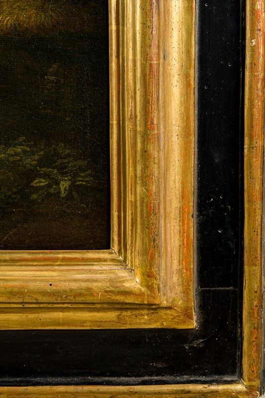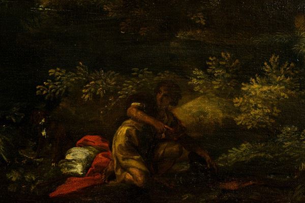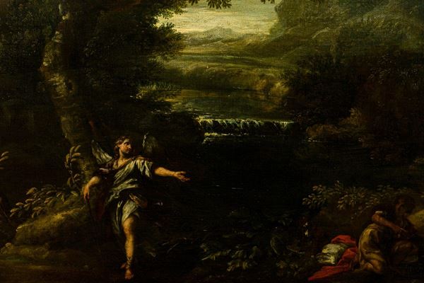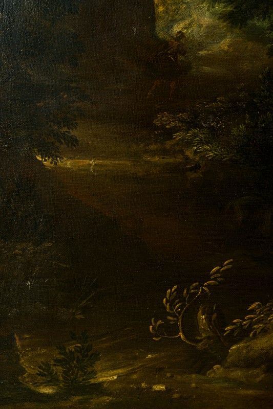 L'autore del bellissimo paesaggio ideale qui proposto, richiama fortemente alcune opere di Giovanni Francesco Grimaldi - Il Bolognese: la ripresa puntuale di alcuni stilemi caratteristici del Maestro fanno quindi propendere per un'attribuzione al pittore sopracitato.