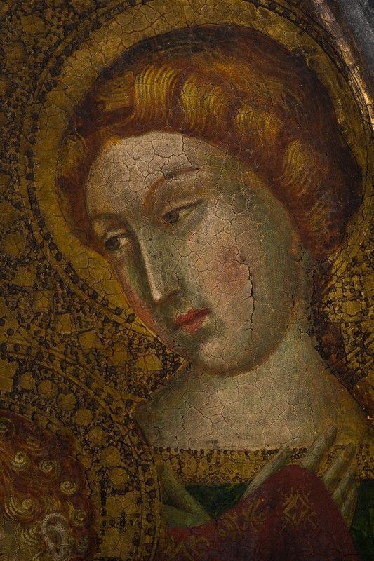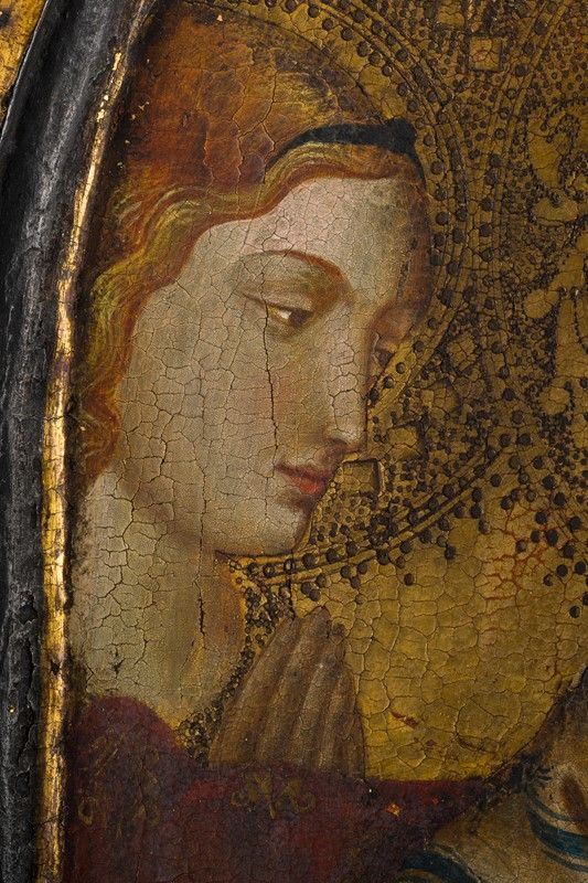 Il colore scuro della parte inferiore è però bilanciato dai preziosi virtuosismi delle punzonature delle aureole dei quattro protagonisti e dall'elaborata decorazione del velo della Vergine, complesso quanto quello della tavola senese.