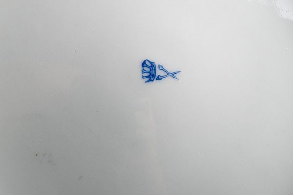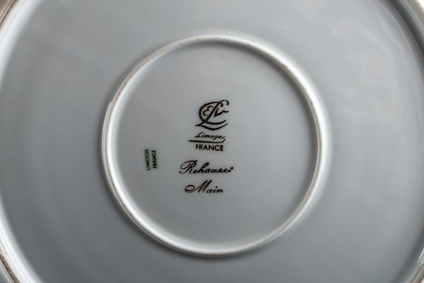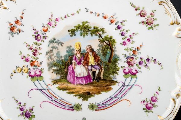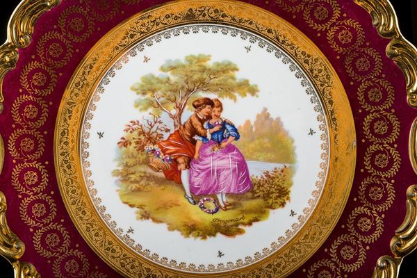 Di cui: un piatto decorato con scena galante e bordature dorate, marcato Capodimonte ( 28 cm); un piatto decorato con scena galante da Fragonard e bordature dorate, marcato Limoges France Rehaussé Main (33 cm).