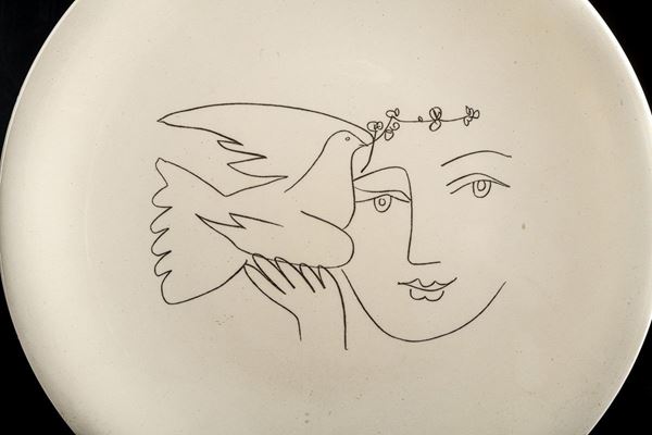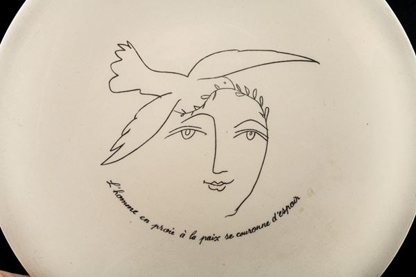 Coppia di piatti "L'homme en proire à la paix se couronne d'espoir". Multiplo da un disegno di Pablo Picasso realizzato nel 1950 e tratto da una poesia di Paul Eluard. Salins France. Già predisposti per essere appesi.