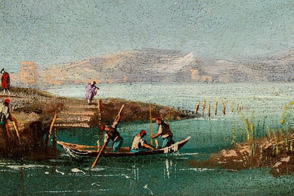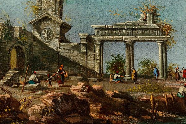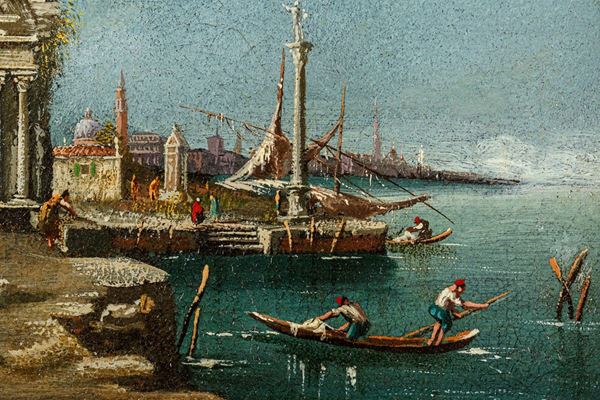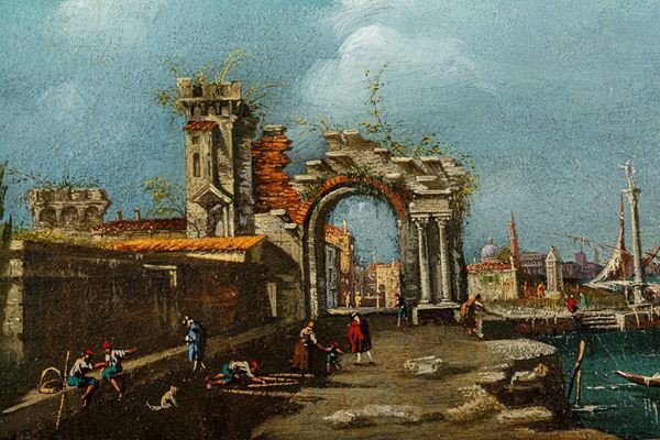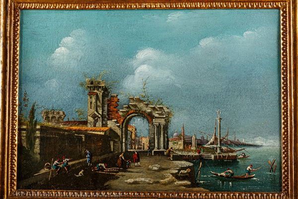 I dipinti, reintelati, presentano qualche ridipintura sullo sfondo, nella parte superiore della composizione. Le figure e gli sfondi architettonici risultano integri. In entrambe i capricci (il primo rappresentante i margini della laguna veneta e il secondo scorci di un canale veneziano) è presente il tipico stilema guardesco della mamma che tiene per mano il bimbo, nonché la resa libera e vivace dei protagonisti della scena e del paesaggio. Le condizioni conservative sono più che buone. Cornici coeve.