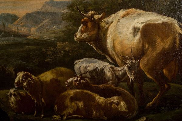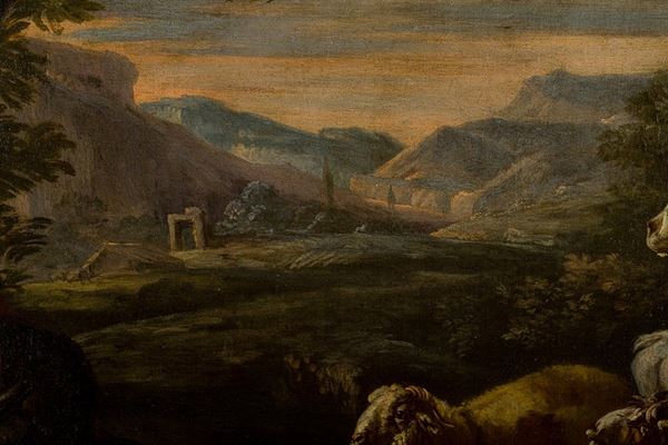 L'autore della tela offerta, che iscrive e data la roccia su cui si dispone il gregge (Fanoni - non decifrabile; 169...), risente non solo dell'influsso del pittore tedesco Philipp Peter Ross (Rosa da Tivoli) ma anche degli insegnamenti di Giacinto Brandi, di cui potrebbe essere allievo e a cui rimanda l'arcadico pastorello sulla sinistra del dipinto. Sappiamo infatti che Philipp Ross fu attivo nella bottega di Brandi dal 1677 e non è difficile immaginare come il nostro autore abbia attinto a piene mani da entrambe i Maestri.
