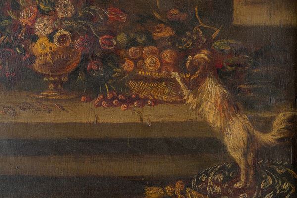 Pittore della fine del XIX secolo; Interno con vasi di fiori e cagnolino., fine del XIX secolo