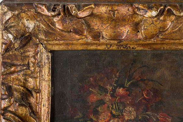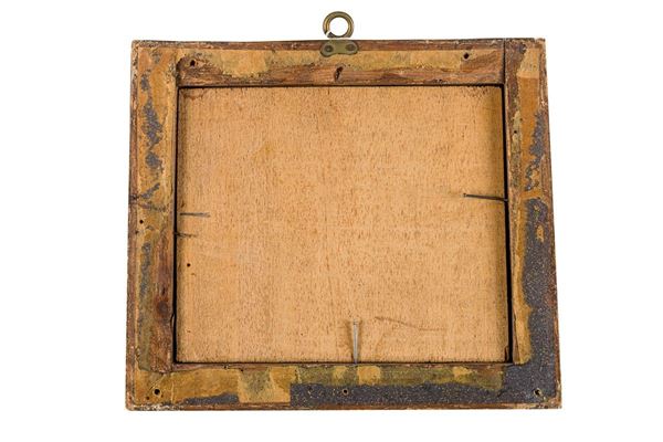 Il dipinto presenta un piccolo foro (dovuto a insetti xilofagi) e diverse ma minute lacune (tutte risarcite). In cornice.