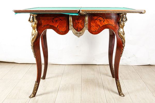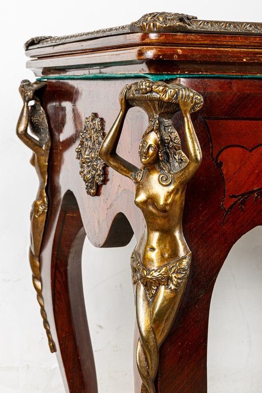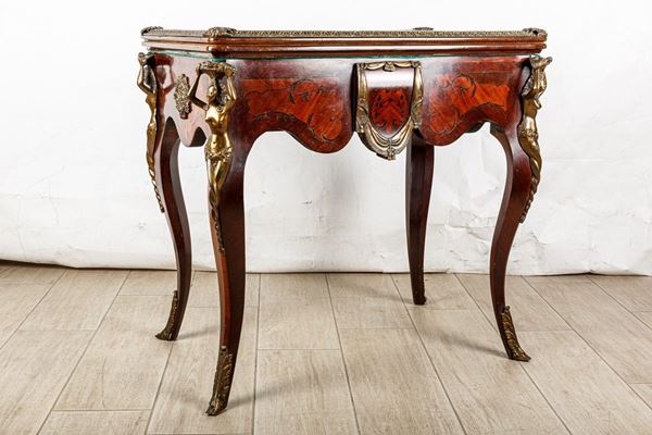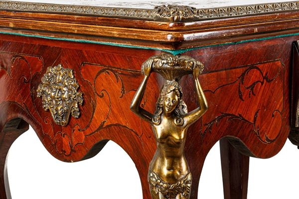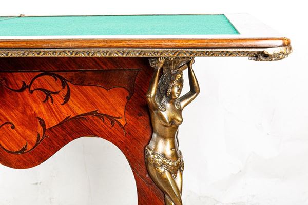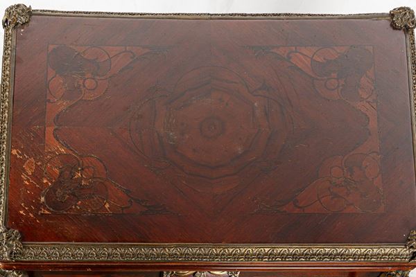 intarsiato in legni vari con rifiniture in bronzo. Piccoli difetti.