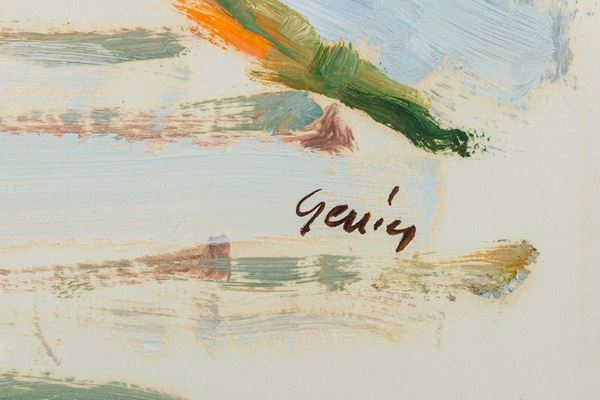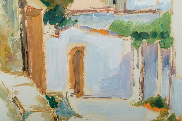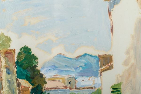 Veduta di paese con montagne sullo sfondo, seconda metà del XX secolo