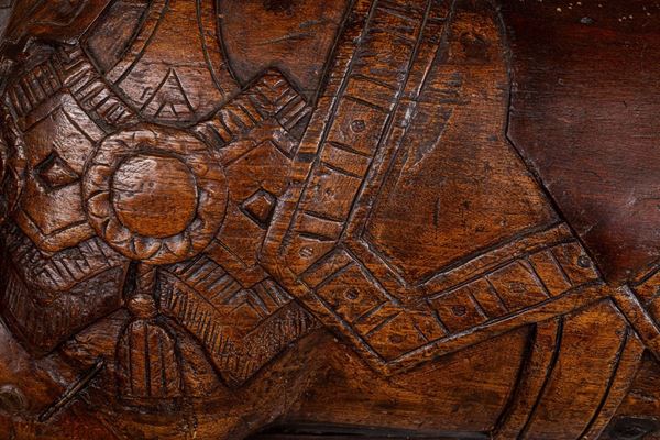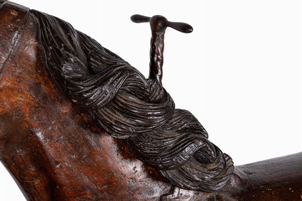 scultura in volume, in legno a patina bruna, piccoli fori da insetti xilofagi non attivi.