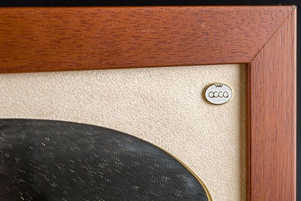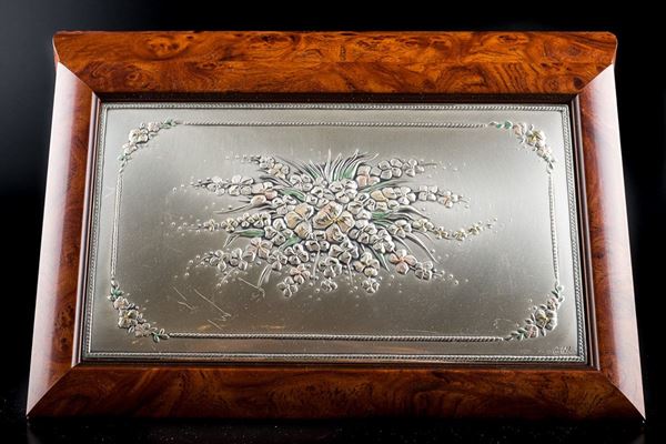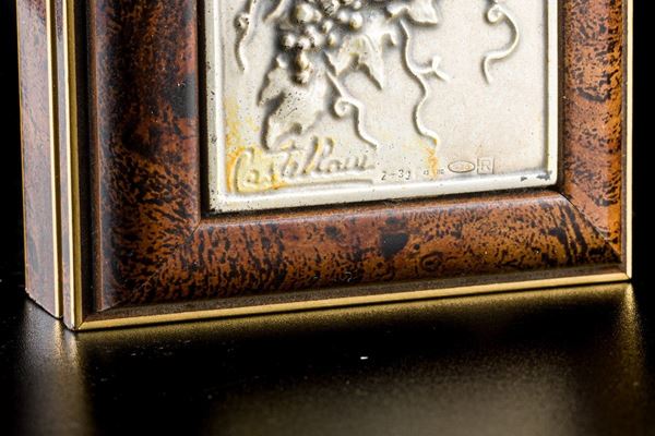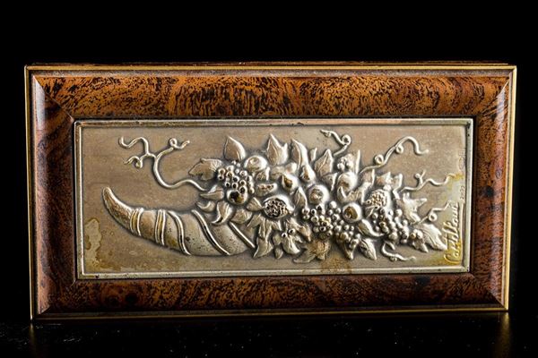 placche sbalzate con motivi floreali e cornucopia, firmate Castellani, specchio all'interno della più grande