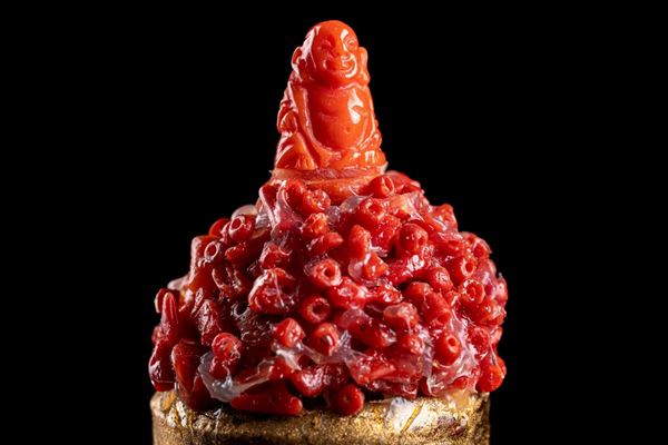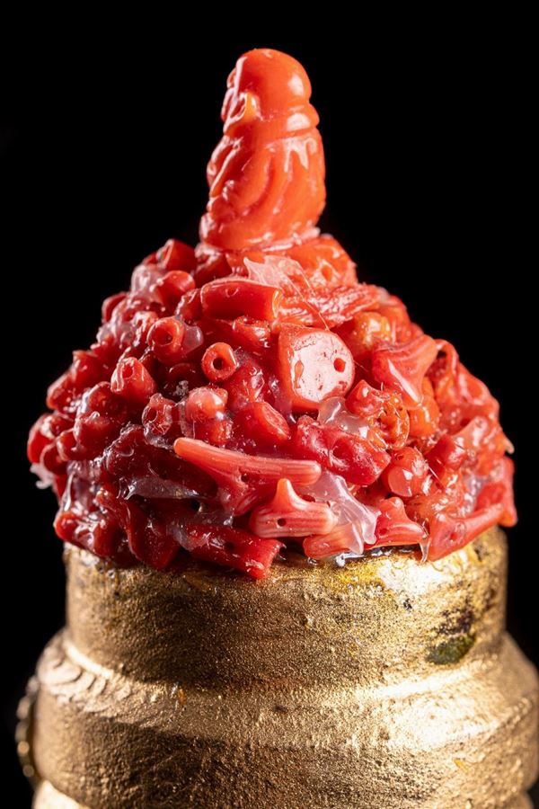 in corallo cerasuolo, su roccia in frammenti di corallo e base in legno dorato.