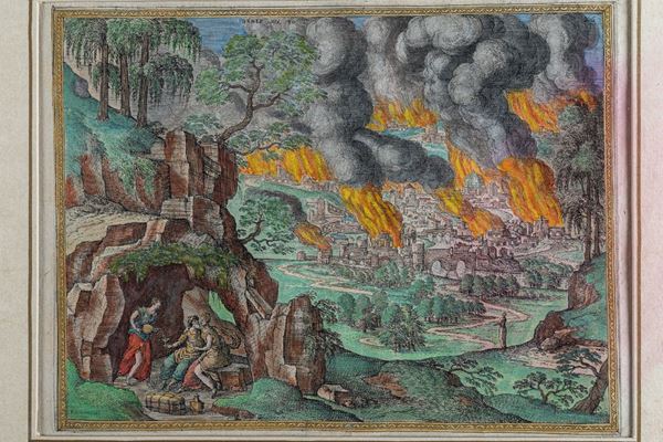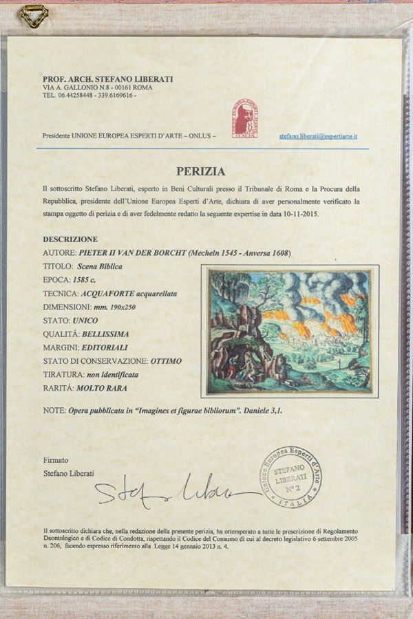 Opera pubblicata in "Imagines et figurae bibliorum". Daniele 3,1. In cornice, con al retro perizia del professor Stefano Liberati.