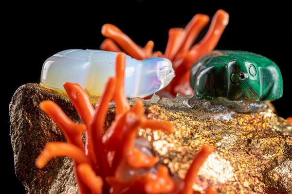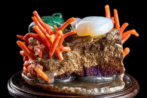 in giada di vari colori, coralli cerasuolo, su roccia in pietra e base in legno