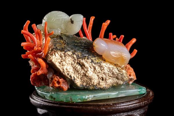 in giada di vari colori e rametti in corallo cerasuolo, su roccia in pietra e base in legno