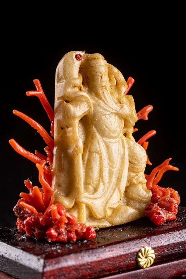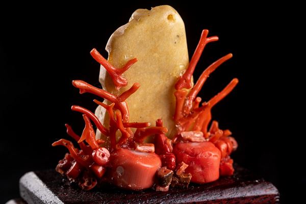 in diaspro giallo, con rami in corallo, su base in legno