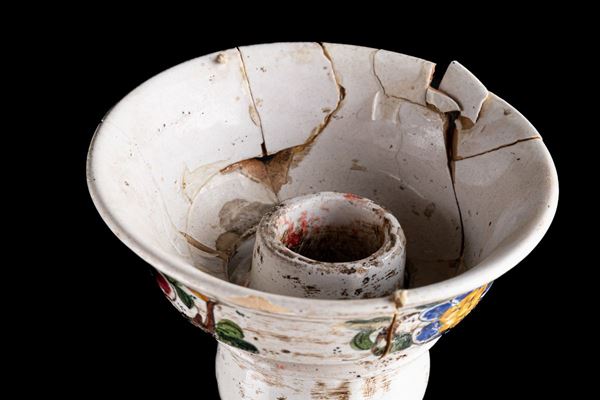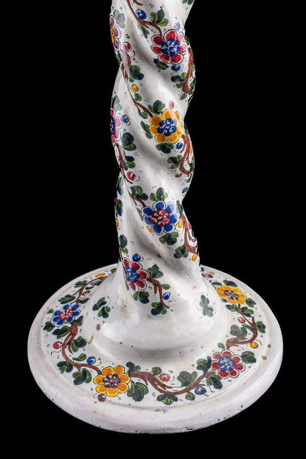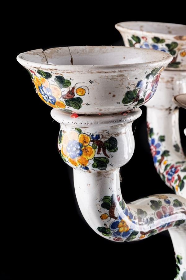 a quattro luci, corpo tortile con decoloro floreale su fondo bianco, manifattura Bargello - Gubbio, una bobaech mancante. Difetti e rotture alle altre sette.