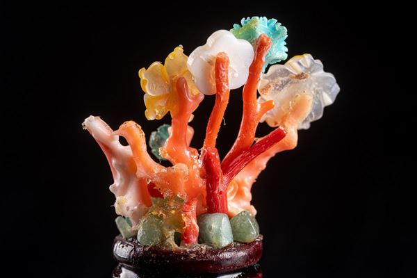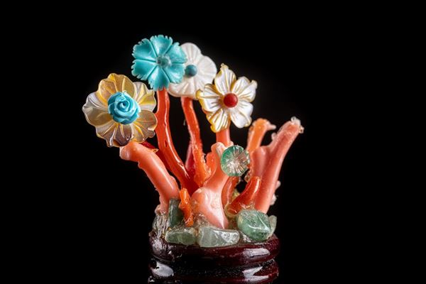 con fiori in madre perla e inserti in pietre dure, su base in legno