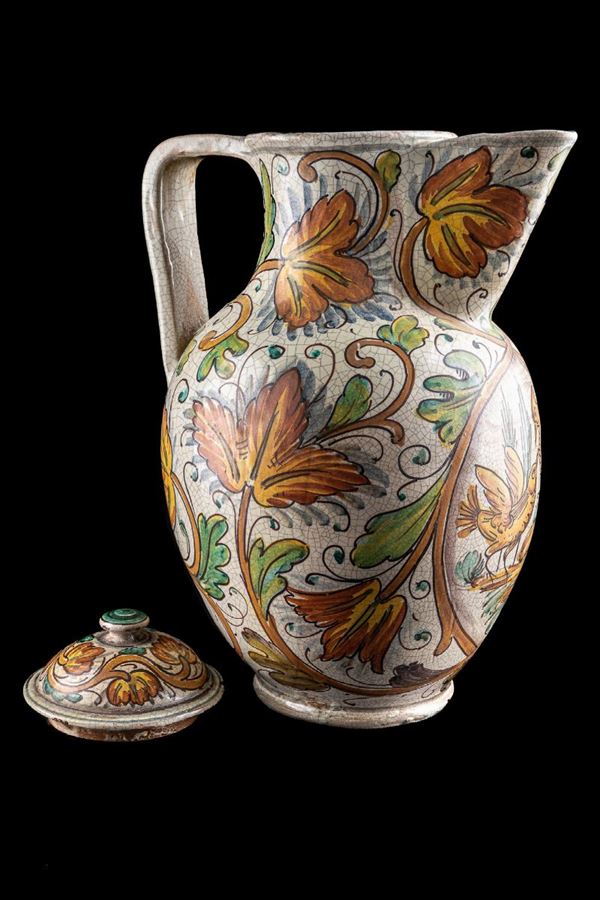a corpo globulare, con versatoio nel collo ed ansa a nastro. A decoro floreale su fondo bianco, con volatili entro riserva sul fronte, provvisto di coperchio.