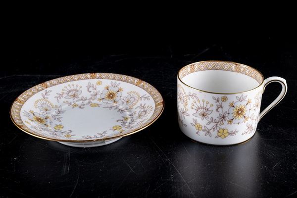 in porcellana bianca, con decoro floreale e finiture in oro zecchino.