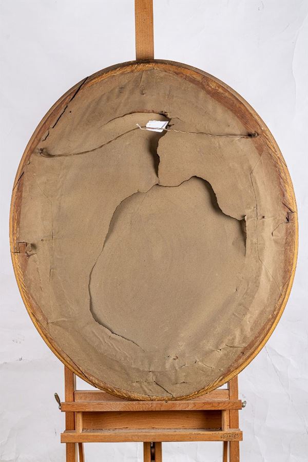 ad assetto ovale, entro cornice in legno ad oro zecchino con baccellature. Difetti alla cornice. Misure con cornice: 94 x 80 cm cadute di colore sulla chioma