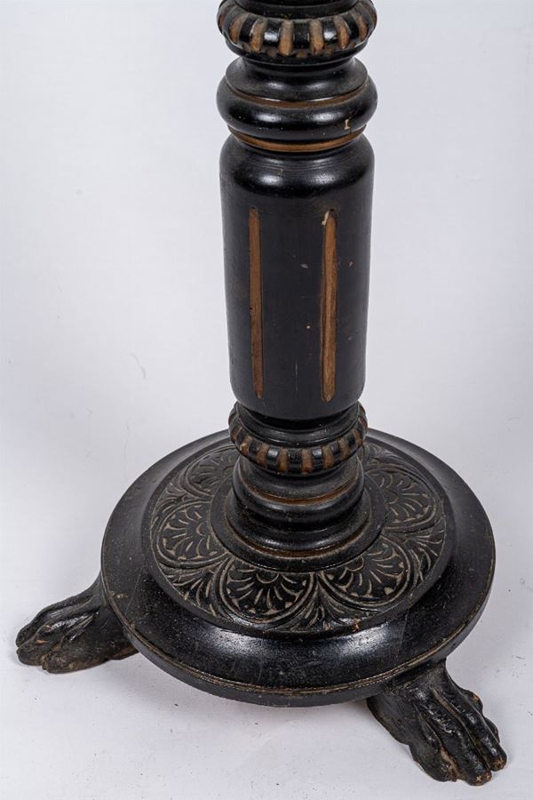 In legno a patina bruna, colonna tortile, con tre piedi d’appoggio ferini, parti incise e scolpite.