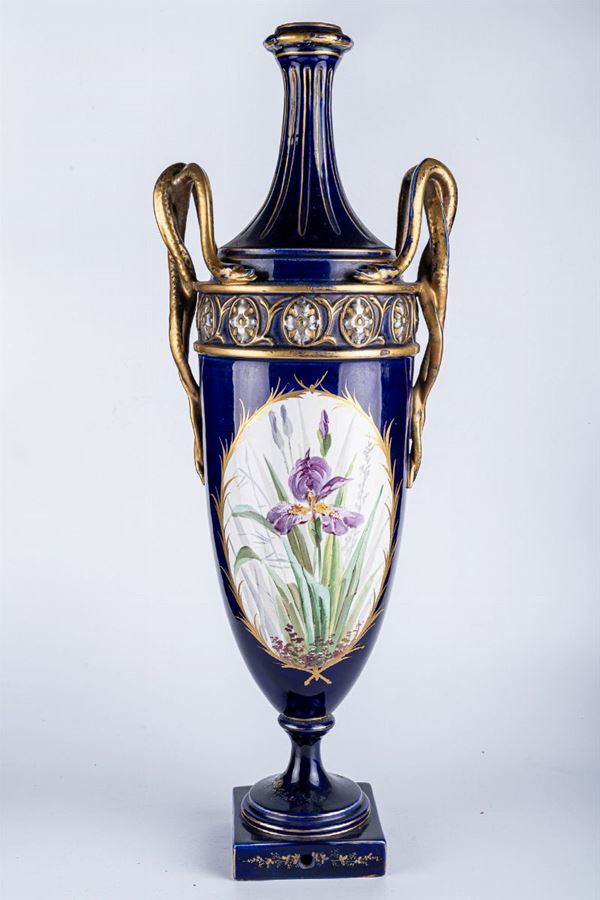 a forma di vaso, in ceramica blu con decoro floreale entro riserve dorate, corpo ad urna, con anse tortili a serpenti e finiture in oro zecchino. Firmato alla base.