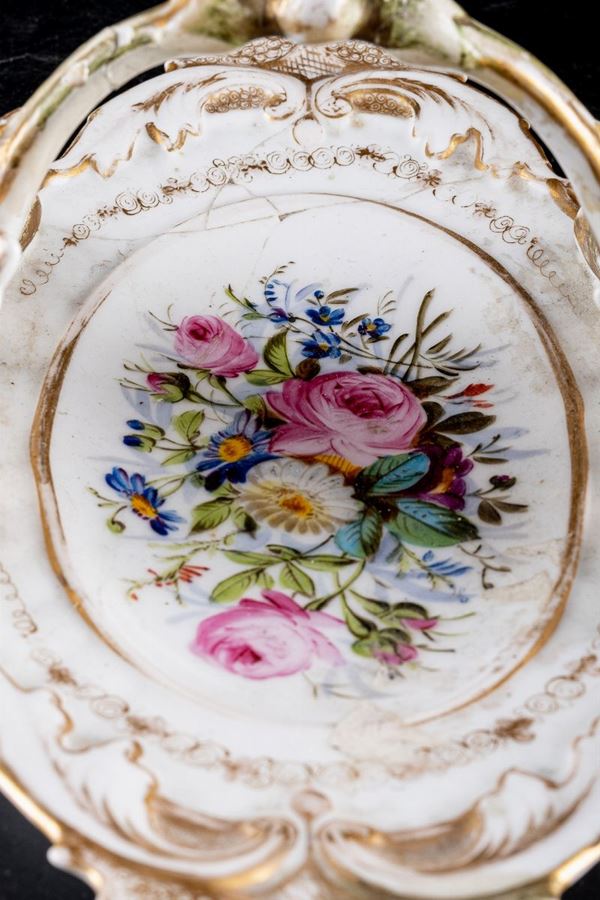 in porcellana bianca a decoro floreale, con finitura in oro zecchino. Parti rotte e restaurate.