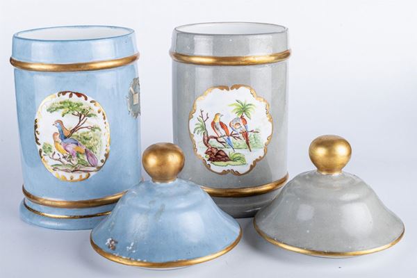 in porcellana policroma azzurra e grigia, con scene di animali e fiori entro riserve dorate e finiture in oro zecchino.