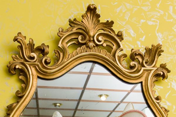 in legno dorato centinato, di forma barocca, a 2 luci, con specchio, con decorazioni floreali scolpite. Un braccetto restaurato. L'oggetto è visionabile solo in foto e dovrà essere ritirato direttamente dalla casa del proprietario, previo appuntamento (Roma)