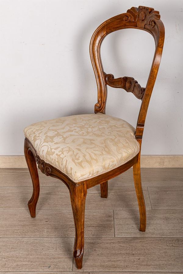 in legno di noce, con schiena a uovo, gambe a virgola, con seduta in seta color avorio.