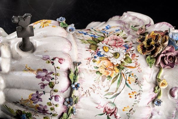 In ceramica policroma, corpo e coperchio costolati, con finiture a fiori a rilievo. Piccole mancanze (manca la chiavetta dell’ugello).