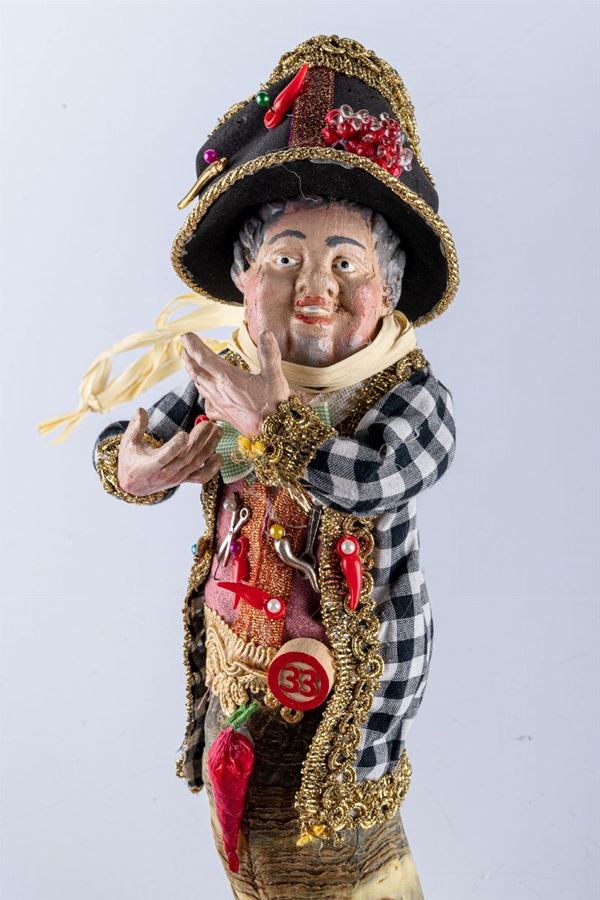 Scultura in volume, montata su corno di bue. Testa e mani del personaggio in ceramica.