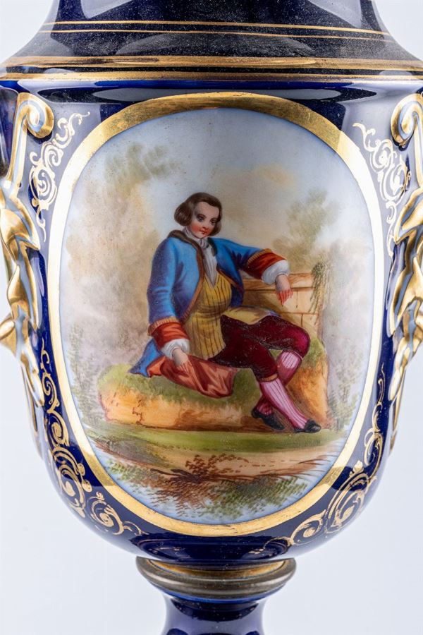 in porcellana blu con motivi floreali e scena di genere, entro riserva sul corpo del vaso. Anse a riccio con ghirlanda, finiture in oro zecchino. Montata su base in bronzo.