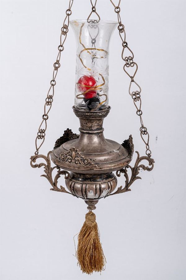 in metallo argentato di forma neoclassica, con 3 braccia. Parti incise e a rilievo. Stelo in cristallo lavorato alla mola. Elettrificata.