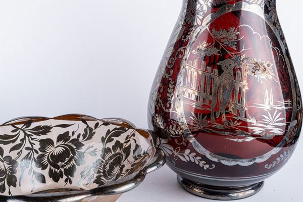 composto da 1 centrotavola e un vaso in vetro fumé, con decoro in platino, a motivi vegetali e scene animali.