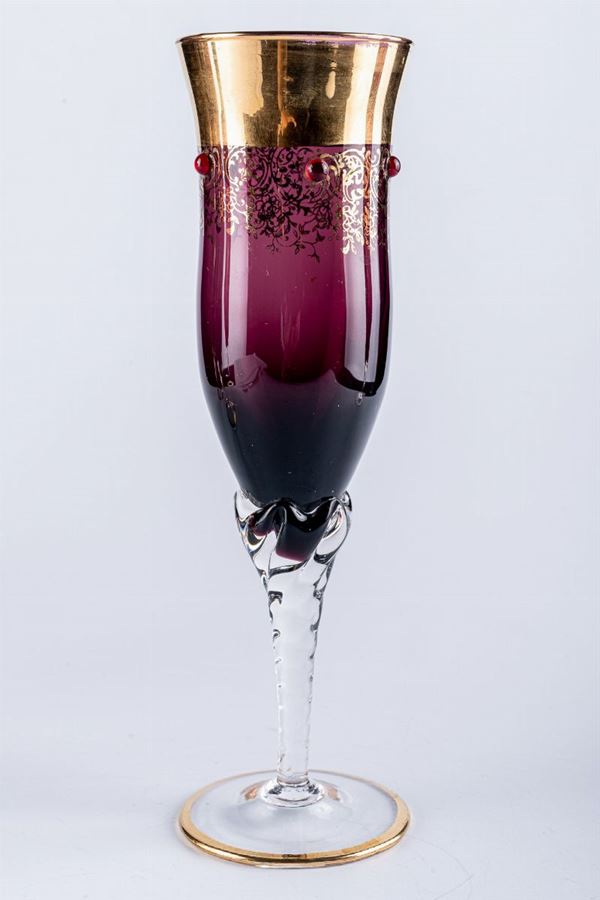 in vetro rosso di Boemia, con finitura in oro zecchino e gocce in vetro rosso.