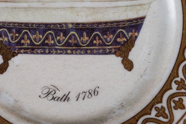 in porcellana bianca con allegoria del bagno al centro del fondo, tesa con decorazioni stilizzate in oro zecchino, collezione Henriette.