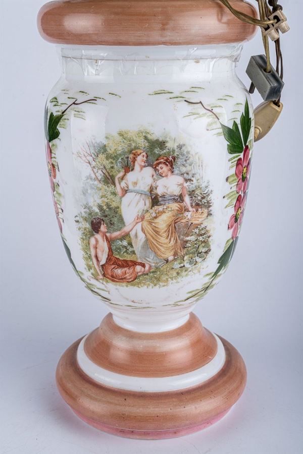Elettrificato, in pasta di vetro bianco e nocciola, con scena di genere dipinta nel corpo del vaso, a fondo bianco.